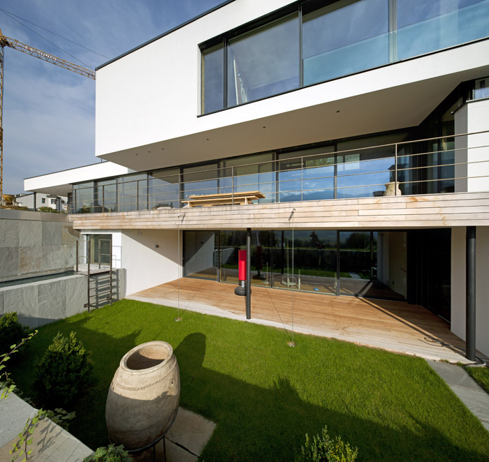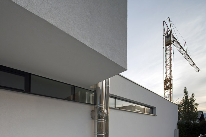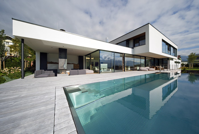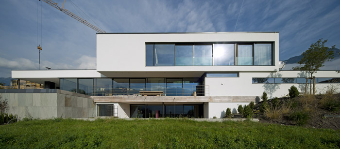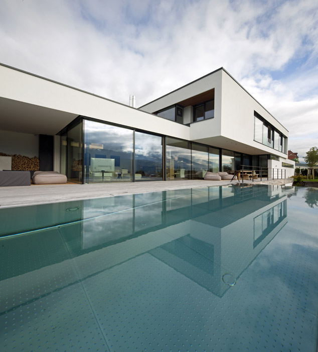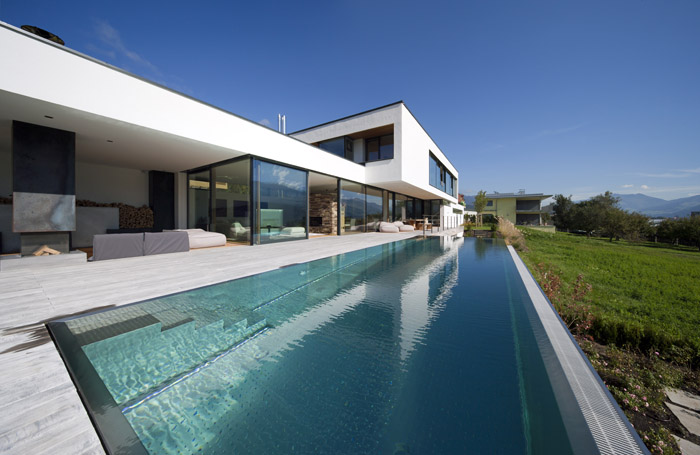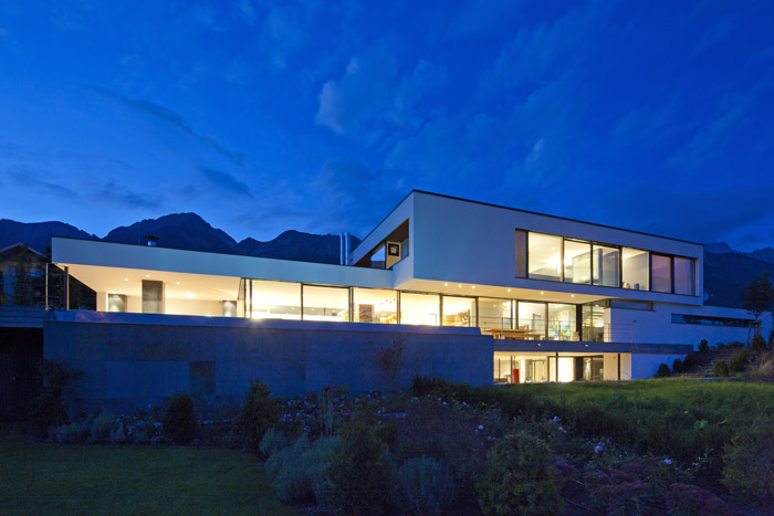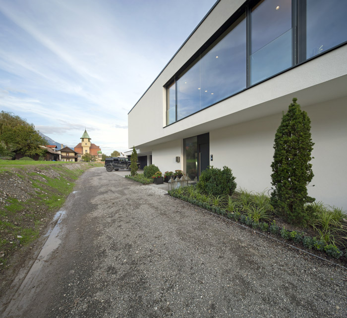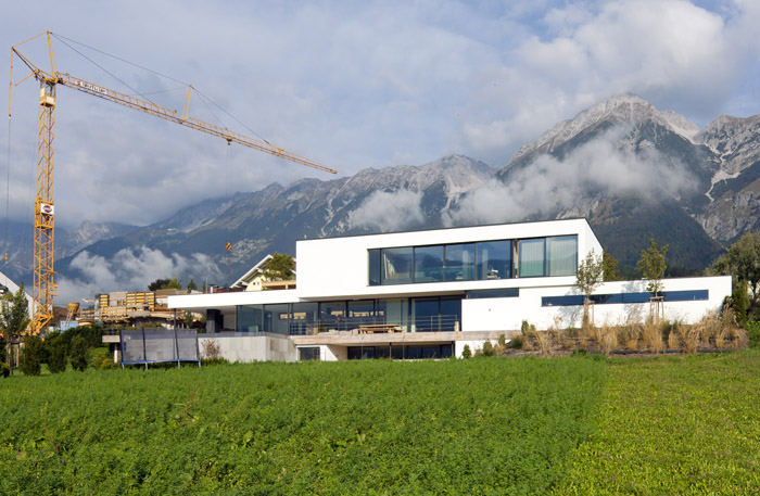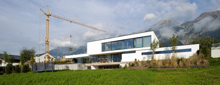 Das Grundstück befindet sich unterhalb des Ortszentrums von Rum, einer grossen Gemeinde im Einzugsgebiet der Tiroler Landeshauptstadt Innsbruck. Die Grossform des Gebäudes ist aufgrund der länglichen und schmalen Form der beiden neben-einanderliegenden Parzellen bereits vorgegeben. Es präsentiert sich als lang-gezogener schlanker Baukörper, der mit der Garage im Osten und dem überdachten Loungebereich im Westen eine Länge von 45 Metern aufweist. Im mittleren Bereich ist das Obergeschoss mit dem Schlaftrakt als rechteckiger weisser Kubus aufgesetzt, der nach beiden Seiten auskragt und dadurch im Süden einen Teil der Terrasse und im Norden den Eingangsbereich überdacht. Durch das leicht nach Südosten hin abfallende Gelände ergibt sich die Möglichkeit, auch das Untergeschoss grosszügig zu belichten.