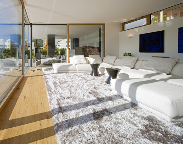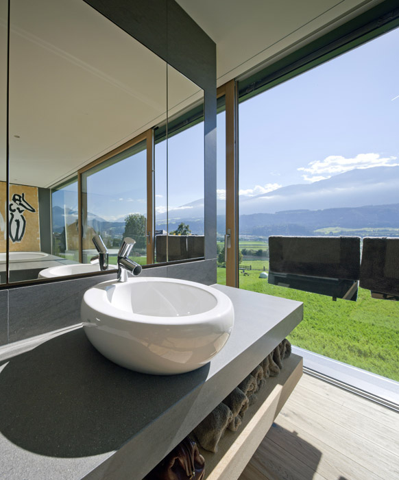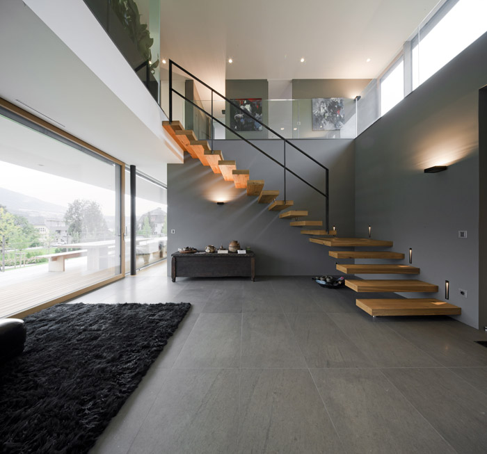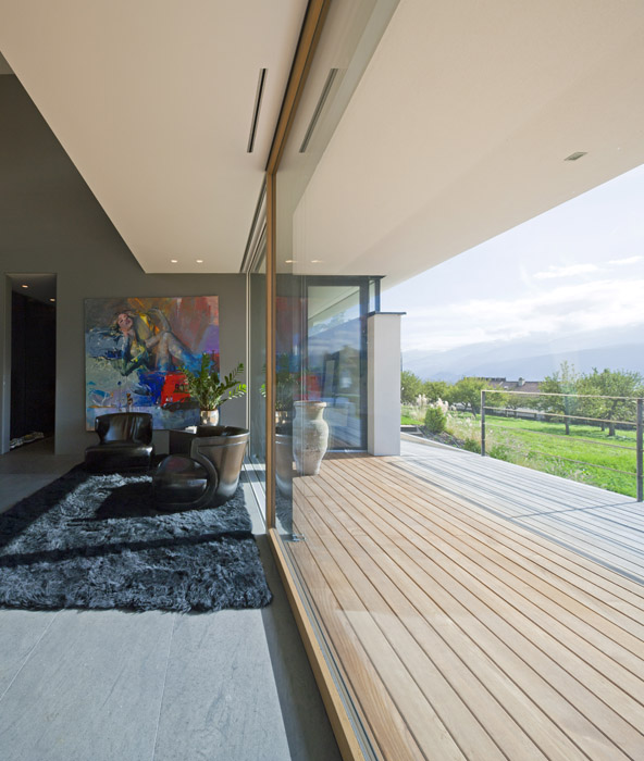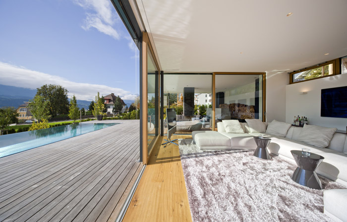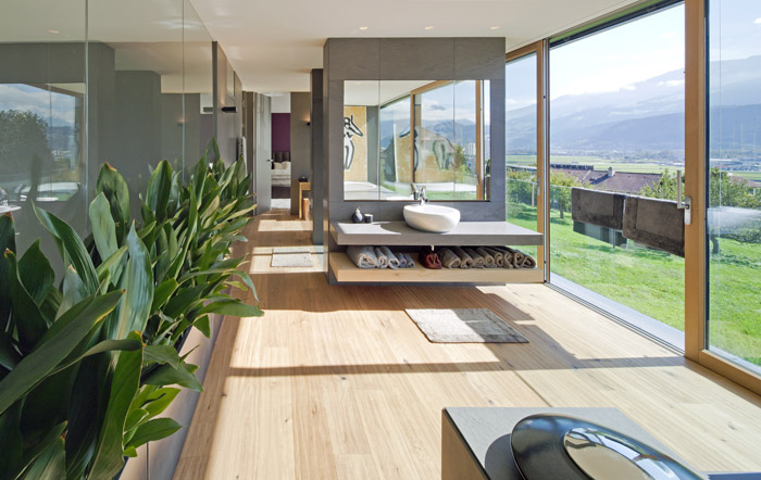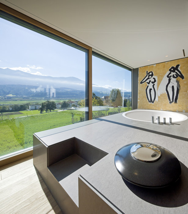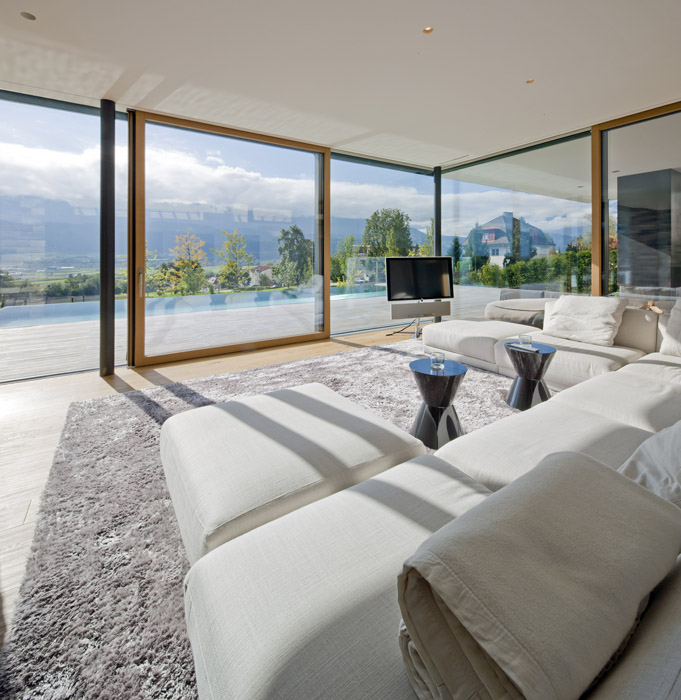 Obwohl das Unter- und Ergeschoss in Massivbauweise und somit anders als das Obergeschoss mit vorgefertigten Holzelementen errichtet wurden, sind die Oberflächen einheitlich weiss verputzt. Nach Süden zum Tal hin öffnen sich die Räume mit raumhohen rahmenlosen Verglasungen, bergseitig hingegen sind nur wenige punktuelle Öffnungen gesetzt, die das beeindruckende Panorama der Nordkette einfangen: ein langer Lichtschlitz im Wohn- und Essbereich und eine 20m² grosse Panoramaverglasung in der Galerie des Eingangsfoyers.