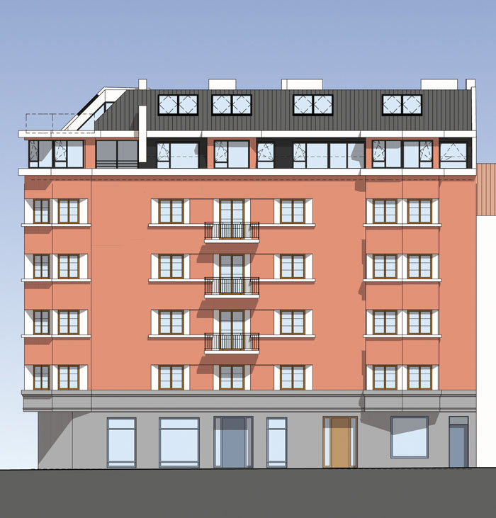 Im 5. und 6.Stock (Dachgeschoss und Galeriegeschoss 2) des Hauses Pradlerstraße 41, Innsbruck Pradl, werden die Wohnungen W10, W11 und W12 als Dachmaisonetten neu errichtet. Das Haus mit einer Grundfläche von etwa 25,00 x 13,00m befindet sich an der Ecke einer Blockrandbebauung im Innsbrucker Stadtteil Pradl. Die Straßenfassade ist nach Westen zur Pradlerstraße und nach Norden zur Amthorstraße hin orientiert. Die Hoffassade im Dachgeschoss ist nach Osten zum großen, unverbauten Innenhof orientiert.